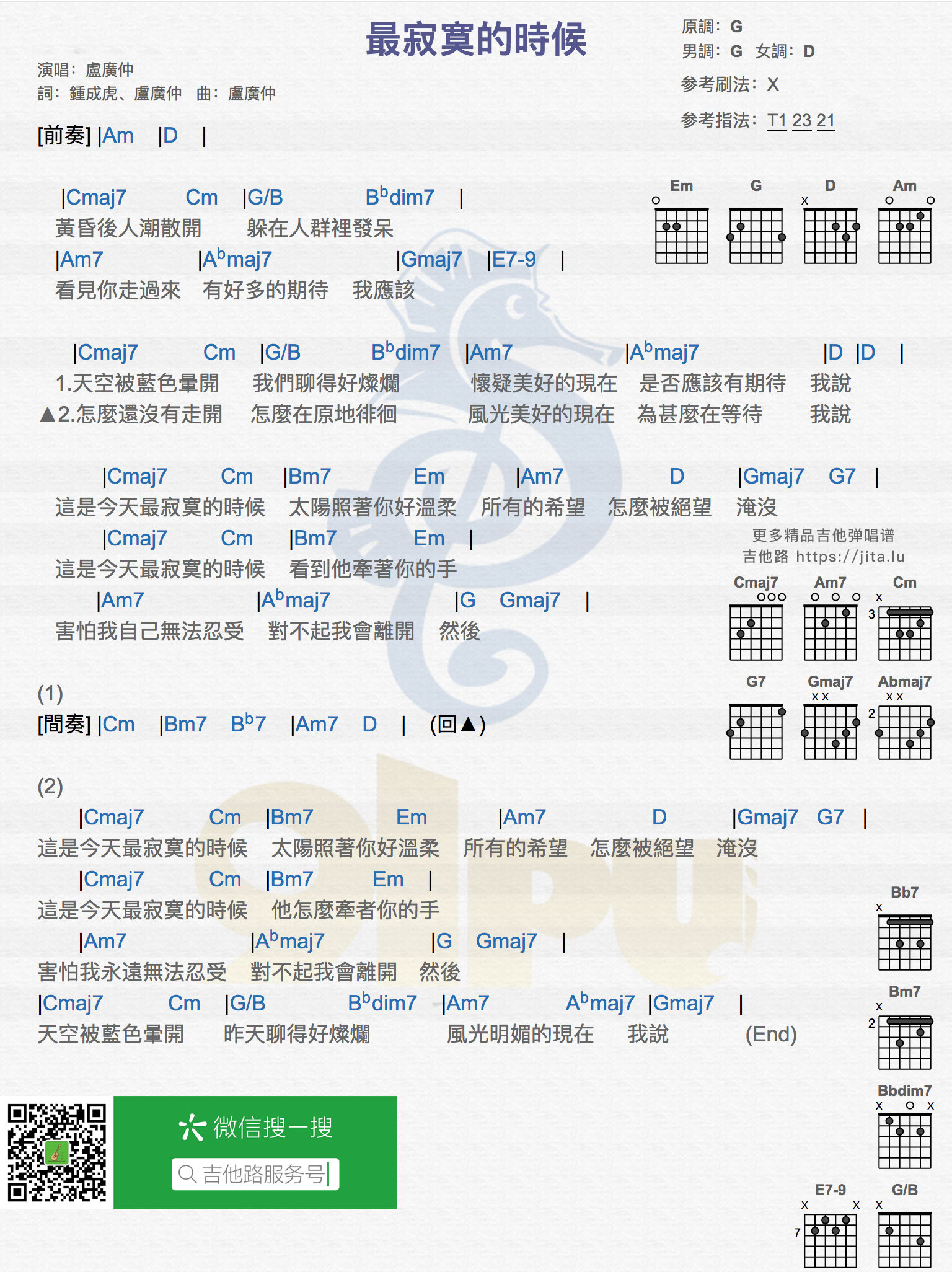 卢广仲《最寂寞的时候》吉他谱 G调吉他弹唱谱 1 发布于 1年前2小时前 有 6477 人看过 这首卢广仲《最寂寞的时候》吉他弹唱谱是由吉他网友编配并分享的吉他谱,谱子是 G 调图片吉他谱,原调为 G 调,吉他谱调为 G 调指法,节拍为 4/4 拍,男生弹唱的时候建议不使用变调夹,女生弹唱的时候建议使用变调夹夹 5 品。